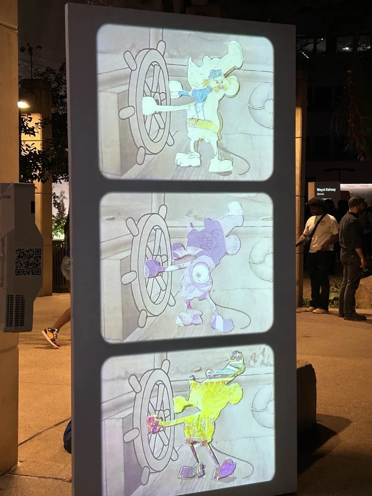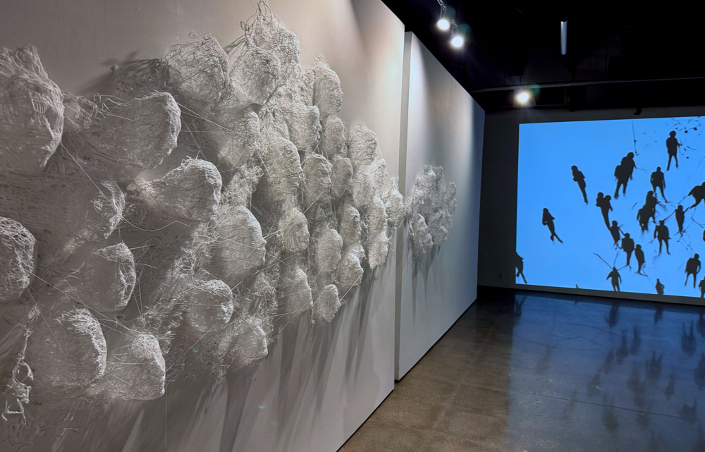 The audience engages with the piece by standing in front of the projection, allowing their shadows to become an integral part of the artwork.